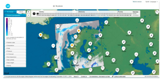 YR.no (Figure 4) is a Norwegian web portal and mobile app, including a map showing weather information. The user can choose to see the weather in the form of text, symbols, and diagrams or as a map. The meteorological map is available for Europe and Asia. The map’s composition is divided into three areas: a layer switching menu, timeline, and the top bar dedicated to search.