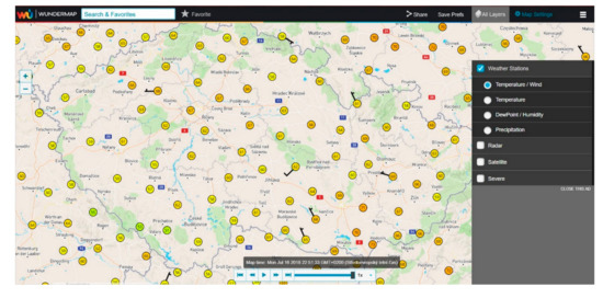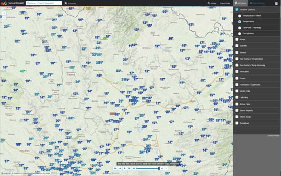 Wundermap (Figure 5) is produced by German Weather Underground. The map is loaded directly and the data are provided for the whole world. The page is divided into several blocks that are somewhat chaotically deployed: at the top is a search box and a button for sharing or switching on/off the thematic layer menu, in the right corner is a panel to control the thematic layers themselves, at the bottom is the timeline. Controls are standard and located in a menu at the edge of the map.