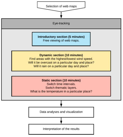 Many modern studies use the eye-tracking technology. Eye-tracking is used for usability tests, evaluation of interactive map interfaces [16], evaluation of animated maps of traffic flows [17], analyses of maps and plans [18], analyses of 3D geovisualizations [19], analyses of dynamic stimuli [20,21,22,23,24], and in general to evaluate the process of map reading and map use [25]. User studies in cartography provide enormous opportunities for further development of maps [26].