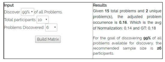The online calculator MeasuringU [41] (https://measuringu.com/problem_discovery/), which calculates an estimated sample size from the given occurrence of problems, was used to help estimate the ideal number of respondents. This calculator is based on normalization and the binomial probability equation. Problems recorded from the sample of respondents (in this case, the first ten respondents) were entered into the matrix. The calculator estimates how many respondents would be appropriate for testing to detect at least 99% of the problems encountered (Figure 7). In this case, the result was 26 respondents. As mentioned above, a total of 34 respondents participated in the test, which was more than recommended.