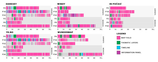 Processing the results of the Dynamic Section was very time-consuming, as it was necessary to analyse data using dynamic Areas of Interest. Since each respondent worked with the map individually, dynamic Areas of Interest were created for each web map and each respondent separately. These areas of interest (AOIs) were: map fields, timer switching, switching of thematic layers and other information such as legends and supplementary charts. These layers were not active throughout testing and appeared according to how respondents clicked on them. Creation of dynamic AOIs is highly time-consuming, so only six respondents were chosen for this type of analysis. Data were visualized using Sequence Chart method, which displays each respondent’s eye-movement data in time as rows. The colour of these rows corresponds to the visited AOIs.