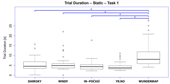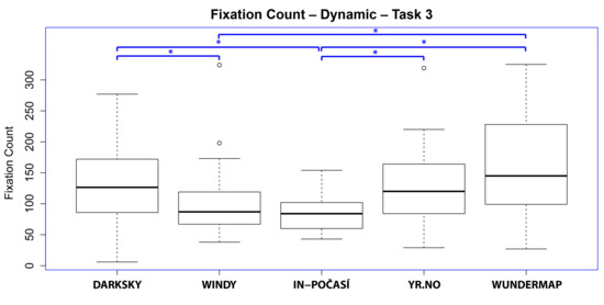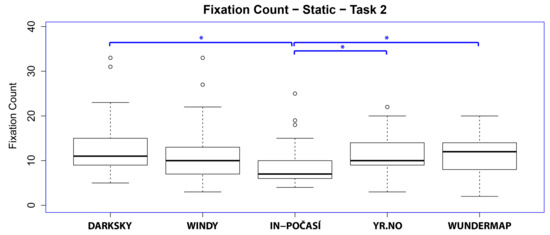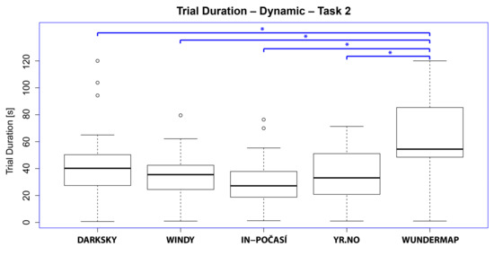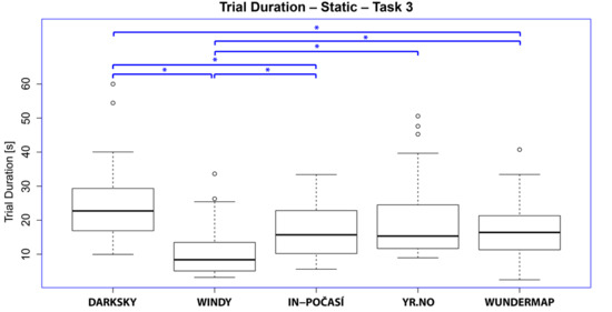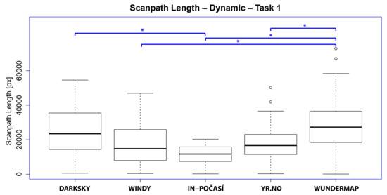 Users worked with web maps in the simplest form; they did not look for hidden functions in the menu or attempt to find any advanced functionality. They primarily looked at the controls on the main screen of the web map. If expandable control panels were available, the respondents only looked at them after they had examined other elements. Therefore, interactive map elements were only explored by respondents after they had become acquainted with the map. Map interactivity was not an obstacle unless it contained too much information or options to choose from. Searching was still quicker in static menus that respondents did not have to switch on or off. Static menus were available on Windy, In-Počasí and Yr.No; it was necessary to switch the menu on/off in DarkSky and Wundermap; Figure 10, Figure 11, Figure 12 and Figure 13 show the better results for the maps with static menus. For example, the average value of Scanpath Length (Figure 10) for maps with static menus was 14,350px; for those with dynamic menus the average Scanpath Length value was 25,355px.