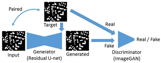 This kind of architecture iteratively trains two neural networks, a generator network and a discriminator network. The generator G is used to capture the data distribution and generates samples similar to those drawn from training data. The discriminator D estimates the probability that a sample comes from the real data, rather than being the outputs of generator. The discriminator provides an adversarial loss, which could force the generated images towards the target manifold [38]. Such kinds of network architectures are currently often used for style transfer [38,39,40], image super-resolution [41], image inpainting, etc. The aim is often to generate photos as realistic as possible. However, for building generalization, we are not only aiming at generating simplified raster building maps at different scales, but the outputs should also look like the buildings in the maps. In this case, the term realistic for GANs means to achieve better rectangularity and parallelism of the building shapes.
