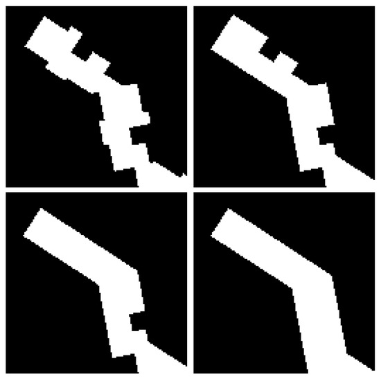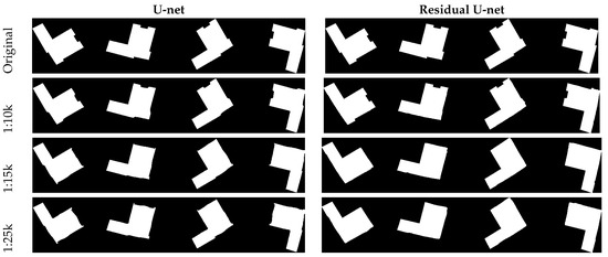 It can be observed that the extrusions and intrusions are continuously eliminated with increasing scale. It is also clear, that the modifications of the building outlines are very subtle for the larger scales, and get more and more visible for the smaller scales. In Figure 12 the offsets vanish with smaller scales, so does the annex in Figure 13. The purpose of this experiment was mainly to check, if there is a dependency on the orientation of the buildings. This is not the case—obviously, the network has learned enough examples of extrusions, intrusions and offsets in different orientations, and is able to generalize them appropriately. A general observation can be made: compared with U-net and GAN, the residual U-net can generate buildings with much better preserved straight lines and corners.