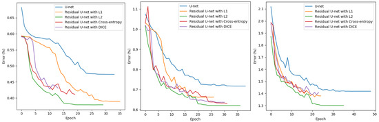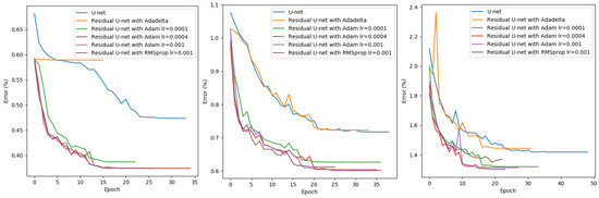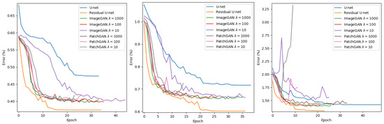 As described in Section 3.3, two possible types of discriminators, namely ImageGAN and PatchGAN, were evaluated. According to Equation (2), the weighting factor plays an important role while training. In the further material, three possible values, 1000, 100 and 10 were observed. Then, we compared the learning curves of different GANs with the baseline U-net and the best performing residual U-net.
