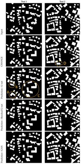 Test 2 in Figure 10 investigated the aggregation where neighbouring objects can be merged. The input and target images were presented together with the predictions from three models. Clearly, the buildings close to each other were merged (see, e.g., the squared block in the lower left corner). The church in D was generalized to a better representation compared with the target output from CHANGE. Compared with the prediction from U-net, the results from residual U-net achieved better straightness of the building borders and preserved some of the corners clearly.