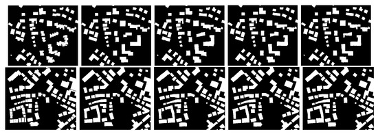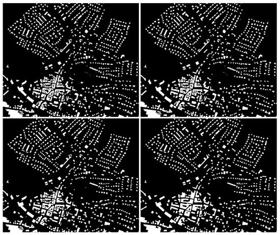 For a selected area in Stuttgart, Germany (shown in Figure 5), a raster building map (42,800 pixel × 35,000 pixel) was generated. This raster image was then partitioned into tiles (128 pixel × 128 pixel) without overlaps (example shown in Figure 6). The image tiles without any building patterns were removed. In total, 31,760 tiles were selected as training set and 3528 tiles (about 10%) were used for validation. In the same way, the corresponding image tiles were generated by CHANGE for all three target map scales.