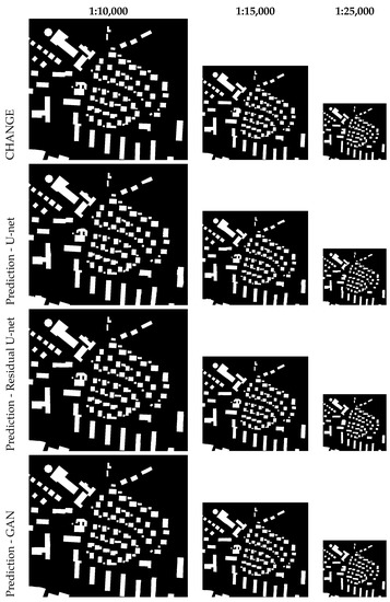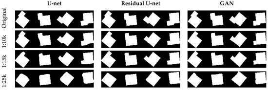 Figure 16 shows the result of a larger area in the target scales 1:10,000, 1:15,000 and 1:25,000, where the same spatial extents are visualized with images in the same size. The extent comprised both residential buildings and industrial buildings, as well as an inner city area. It can be seen that the residual U-net was able to produce appropriate simplifications for the different building types, i.e., rectangular shaped residential buildings and irregular shaped buildings in the city center, where different individual buildings were merged. It was also visible that small buildings have been eliminated in the smaller scales.