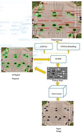Faster R-CNN is used for vehicle detection in this research. The R-CNN family was originally introduced by Girshick et al. in 2013. After several iterations and improvements, Girshick published a second paper, Fast R-CNN, in 2015. A few months later, Girshick published the third paper of this series, Faster R-CNN []. The Faster R-CNN algorithm can be performed in three steps. Figure 1 explains the basic functionality of Faster R-CNN. It takes a raw image as input.