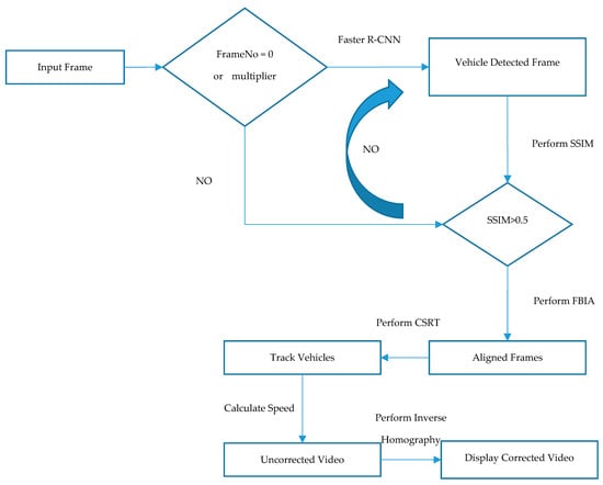 Figure 4 explains the complete framework of the study. The object detection algorithm (Faster R-CNN) must be applied under the three conditions. (a) for the first frame, (b) frame number multiple of 100 or c) SSIM index is less than 0.5. Then FBIA is applied for image alignment, and CSRT is applied for object tracking when SSIM index is more than 0.5. The speeds of the vehicles are calculated from the gathered statistics during the tracking process. Image alignment (FBIA) process can distort the video frames; hence, applying inverse homography is important to get undistorted video frames with tracking information.