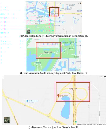 An Inspire I V2.0 UAV with a ZENMUSE X3 optical camera is used for this study. The camera is equipped with 4 k video, 16 MP, 3-axis gimbal. Two types of videos are captured for the experiment: while the drone is static and while the drone is moving. The videos are collected from three different locations for this study: (a) the intersection of Glades Road and State Road 441 in Boca Raton, FL (Static video), (b) Burt Aaronson South County Regional Park, Boca Raton, FL (static and moving), and (c) Bluegrass Yeehaw junction, Okeechobee, FL (moving). Figure 5 shows their locations in Google Maps.