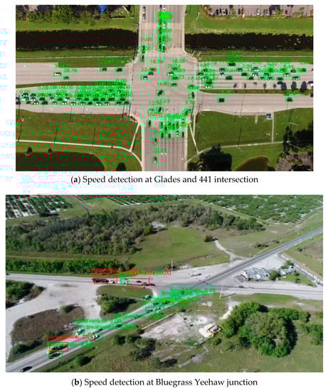Vehicle detection and tracking is the building block of this study to detect the speed of the vehicles. It is very important to detect and track the vehicles precisely and accurately to get accurate speed detection results. Kanistras et al. [] presented a survey on vehicle detection and tracking using UAVs. According to the research community, detection of vehicles can be characterized into two categories: (i) optical-flow and (ii) feature extraction and matching. Objects can be tracked and detected in contiguous frames by optical flow, but the movement is a conjugate of both camera and vehicular motion. Motions of the object and camera were separately calculated by a method designed by Rodríguez-Canosa et al. []. They developed a system to generate a vehicle’s dynamic information, such as positions and velocities, by using consecutive video frames. They developed four major modules to generate the trajectory of a vehicle. These are feature extraction, image registration, vehicle shape detection, and vehicle tracking. Alpatov et al. [] developed vehicle detection and counting systems considering road situation analysis tasks for traffic control and ensuring safety. A vehicle detection and counting algorithm, and a road marking detection algorithm were proposed. The algorithms were designed to process images obtained from a stationary camera. The vehicle detection and counting algorithm was implemented and also tested on an embedded platform of smart cameras. Eamthanakul et al. [] designed a Traffic Congestion Investigating System by Image Processing from closed circuit television (CCTV) Camera to check a traffic condition from a traffic image on the road. Then, a user can check in advance for a traffic condition in a specific time. Seenouvong et al. [] proposed a computer vision-based video detection method for vehicle detection and counting. The method found foreground objects using a background subtraction algorithm. Several computer vision techniques, such as thresholding, hole filling, and adaptive morphology operations, were applied to detect moving vehicles. Qin et al. [] implemented a dynamic target detection method based on the fusion of optical flow and neural network. Xu et al. [] used low-angle camera videos for detection and tracking and used a cellular neural network for background subtraction. Then, optical flow was used on the refined video. Elloumi et al. [] proposed a UAV-based real-time monitoring (RTM) system with multiple UAVs to monitor traffic within city roads. To this end, the authors studied the impact of mobile UAV trajectories and the number of controlled vehicles on the event detection rate.