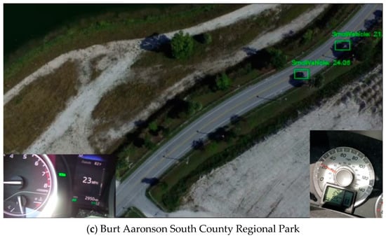 To measure the accuracy at the Glades Road and Bluegrass locations, we picked out two spots on the map and measured the distance using Google Maps. Then we counted the time each car took to cover the distance to calculate the speed of the cars. At Burt Aaronson Park, we drove two cars and recorded the speedometer readings. Later in the lab, we matched the speedometer recording video with UAV recording and compared the speedometer reading to our framework outputs. In Figure 6c, we can see that the right-side speedometer reads 21 mph, and the framework also shows 21 mph. The left-side speedometer displays 23 mph while the framework shows 24 mph.