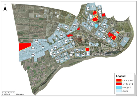 The largest atom had a surface area of 1.27 km2 (it is located in the western, rural part of the area under analysis), while the smallest atom had a surface area of 0.021 km2. The average surface area of all atoms was 0.146 km2 (SD = 0.154).