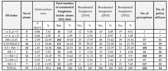 The greatest number of respondents placed their perceptions inside 27 (10 + 5 + 12) atoms (0.5 < IM < 2) in which almost 42% (223 crimes) of the residential burglaries were committed. More than half of the total number of perceptions was placed in the area of 3.69 km2 (32.67% of the total area of the atoms). Keeping in mind the number of respondents who marked at least one location in the given area and the ratio between the marked locations and the committed crimes (IM), we may conclude that it is an environment in which the residential burglary risk is well known to police officers.