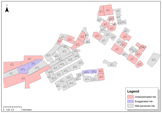 There are 4 atoms with exaggerated risk and 25 atoms with underestimated risk. Well perceived risk is present in 47 atoms. The number of atoms where risk is well perceived is greater than those where exaggerated or underestimated risk is perceived (47 vs. 29). When surface area is compared, approximately the same area is entailed by atoms where risk is well perceived and those with exaggerated or underestimated risk (5.80 km2 vs. 5.69 km2), as shown in Table 1.