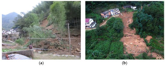 Examples of landslide types in southern Anhui, China: (a) landslide in Xuanzhou county, (b) landslide in Yuexi county.
