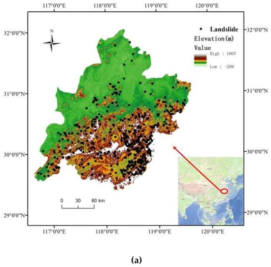 The study area, southern Anhui, is prone to frequent landslides. Situated in eastern mainland China (29°31′–31° N, 116°31′–119°45′ E), the study area is under the jurisdiction of Anhui Province and encompasses a total area of 36,536 km2. Records show that 707 landslides have occurred in the study area in recent years. Landslide development in the study area is primarily controlled by such basic factors as geological structure, terrain and landforms and hydrometeorological conditions. Located within the Yangtze stratigraphic region, the study area has a complex geological structure with residual Neoarchean and Paleoproterozoic formations composing the deep crust, and primarily Mesoproterozoic metamorphic rock sequences as basement. Faults within the study area are mostly northeast-trending and nearly east–west-trending, which has a significant controlling effect on geomorphic and geological conditions. With complex terrain and landform conditions, the study area is home to high mountains, deep valleys and steep slopes, as well as a wide distribution of phyllite, sandy shale and granite bedrock that has undergone severe weathering. Topographically, the study area gradually increases in elevation from north to south. There are plains in the northern part of southern Anhui along the Yangtze River. However, mountains and hills account for more than 70% of the total area of southern Anhui. There are three mountain ranges within the study area that extend from southwest to northeast, including the Jiuhua, Huangshan and Tianmu ranges. A large number of basins and valleys, mostly approximately 200 m and a few below 100 m in elevation, are distributed between these three parallel mountain ranges. Due to its hydrometeorological conditions, the study area is prone to landslides. Additionally, the study area has a mild subtropical monsoon climate with a wide annual range of temperatures, moderate precipitation, abundant sunshine, a long frost-free season and prevailing easterlies. The water systems in southern Anhui are part of the Yangtze River Basin, which form a dense, water-rich network. As a result of the geological structure, terrain and landform and hydrological conditions, landslides in the study area are zonally distributed, spatially concentrated and uneven. There is a low landslide distribution density in alluvial valley plains and hilly regions below 200 m in elevation. Landslides in regions above 400 m but below 800 m in elevation in the Jiuhua, Huangshan and Tianmu Ranges are zonally distributed along concentrated fault zones. Landslides are concentrated and occur in groups in regions characterized by relatively soft rocks (e.g., phyllite and sandy shale).