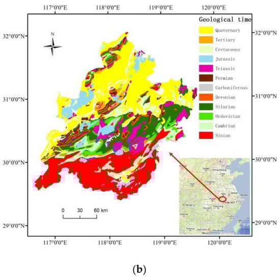 Distribution of landslide sites in southern Anhui, China: (a) elevation map based on a 30 m digital elevation model (DEM) from shuttle radar topography mission (STRM), (b) geologic map of the distribution of rocks of different ages.