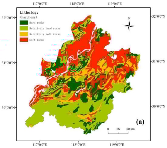 - Lithology: Formation lithology is the material basis for landslide formation and activity. Landslides within a certain region occur within a certain formation. Rock type and hardness affect slope stability and difficulty of surface erosion, and are two of the most important landslide-affecting factors and internal conditions for landslide formation. Landslides vary significantly between formations that differ in geologic age and lithology. Landslides in southern Anhui mostly occur in regions characterized by relatively soft rock.