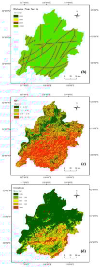 - NDVI: In a region with high vegetation coverage, soil erosion does not occur easily, terrain erosion is slow and the damage to slopes is relatively insignificant. Generally, NDVI is an important index that reflects vegetation cover. The higher the NDVI, the higher the vegetation growth. The probability of landslide occurrence in southern Anhui is relatively high in regions with a high NDVI (0.80–0.86).