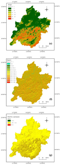 - Profile curvature: Profile curvature is categorized into three types—convex slopes (profile curvature > 0.5), concave slopes (profile curvature < −0.5) and linear slopes (−0.5 < profile curvature < 0.5). In contrast, precipitation can easily accumulate on a concave slope, which will soften the soil. Concave slopes in southern Anhui are the most prone to landslides.