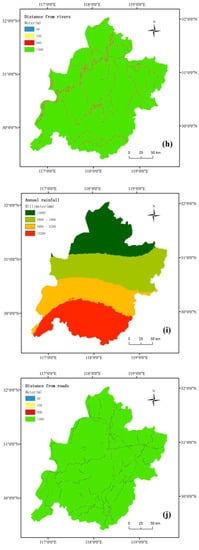 Classification of information contents of the landslide-affecting factors: (a) lithology, (b) distance from faults, (c) NDVI, (d) elevation, (e) slope, (f) aspect, (g) profile curvature, (h) distance from rivers, (i) annual rainfall, (j) distance from roads.