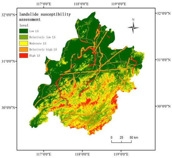 Based on the landslide susceptibility assessment map for southern Anhui (Figure 4), the proportions of regions of southern Anhui with various LS levels (low LS; relatively low LS; moderate LS; relatively high LS; and high LS) can be determined using the GIS-based spatial statistical function, the results of which are as follows: high LS regions account for 21.3%; relatively high LS regions account for 20.6%; moderate LS regions account for 20.1%; relatively low LS regions account for 11.7%; and low LS regions account for 26.3%.