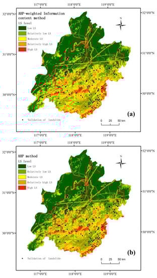 Based on the landslide susceptibility assessment results, 212 random landslide sites were introduced as validation data, and the proportions of random landslide sites in regions of each LS level were calculated using the AHP-weighted information content method, the AHP method and the information content method, respectively (as shown in Figure 6).