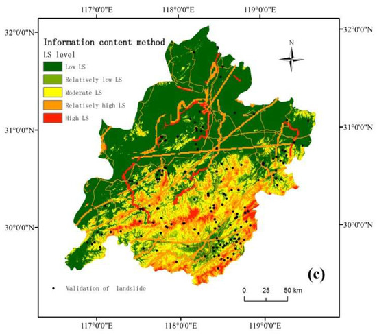 Validation of LS assessment of 212 randomly selected landslide sites for the validation models. (a) AHP-weighted information content method, (b) AHP method, (c) information content method.