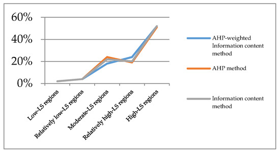 Analysis of the proportion of landslide sites in regions of different LS levels determined using the three methods.