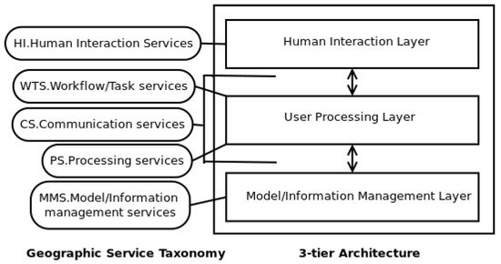 - ISO 19119: This standard is the core of the taxonomy structure and reference architecture. As we explained in Section 3.1 (Figure 2), we followed a three layer-based architecture by assigning services included within each of these layers.