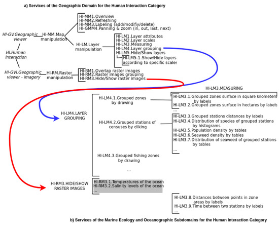 Also, in Figure 2a we show a set of service categories belonging to the ISO 19119 std (in italics) together with new services obtained from specific requirements of the GIS systems. For example, we define (HI-MM) map manipulation services for grouping those related to interactions with maps, or (HI-LM) layer manipulation for services related to interactions with layers. In Figure 2b we show more specializations according to the marine ecology and oceanography subdomains (in gray) for the (HI-LM4) layer grouping (connected with a blue arrow) services, and the (HI-RM3) Hide/show raster manipulation services (connected with a red arrow).
