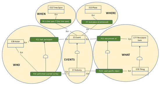 Similarly to efforts carried out by the OGC, paleontological findings can be characterized for documenting and exchanging purposes according to standard guidelines as well. Particularly, the ISO 21127:2014 (Information and documentation—A reference ontology for the interchange of cultural heritage information) proposes a reference ontology for the interchange of cultural heritage information, which is based on the CIDOC Conceptual Reference Model (CRM) (Conceptual Reference Model Version 6.0—http://www.cidoc-crm.org). It provides definitions and a formal structure for describing the implicit and explicit concepts and relationships used in cultural heritage documentation. CIDOC-CRM proposes the use of perspectives (What, Where, Who, Events, and When) to analyze key concepts for management and cataloging of pieces, including fossils, as Figure 3 shows. Domain, country and organization specific schemes are suggested for documenting collections, providing metadata in terms of entities (E) and properties (P).