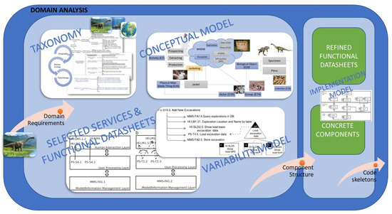 Also, each functional datasheet is represented by a set of XML files that allow to automatically analyze these models in search of inconsistencies or incompatibilities when specifying variability (referred as “Variability Model” in Figure 4) [19,20]. Part of the variability model for the paleontology subdomain is discussed in Section 5.3. Then, a domain component derivation is performed to create reusable components based on the information defined in the functional datasheets [21] (output arrow labeled as “component structure” in Figure 4). We have defined, in previous research, initial mechanisms that assist in the creation of this component structure [22].