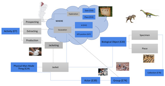 In order to improve data understandability, the model was also defined by mapping the concepts to entities of CIDOC-CRM. As we described in the previous section, these entities are shown as blue rectangles in Figure 5. The paleontological process is abstracted as an Activity (E7), which is specialized into Prospecting, Extracting and Production. Also, the Specimen and Piece are specializations of Biological Object (E20), and Jacket of Physical Man-Made Thing (E24). Other mappings are represented by Date (E50) or Place (E53) as attributes of the explorations, and Id (E42) and GPS Position (E47) of the excavations. Then, Actor (E39), Group (E74) and Collection (E78) are included as in the standard. At the same time, in Figure 5, the WHERE perspective of CIDOC-CRM is easily distinguishable from geoinformation stored as attributes of prospecting and extracting, such as Place (E53) and GPS position (E47).