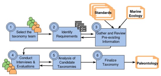 For the creation of the service taxonomy in the paleontology subdomain, we followed the same methodology as presented in [5] by adding new information available and reusing services of the marine ecology taxonomy. This methodology was adapted from the taxonomy development process defined in [15,24] in order to satisfy our requirements. Figure 7 shows the six steps of this process.