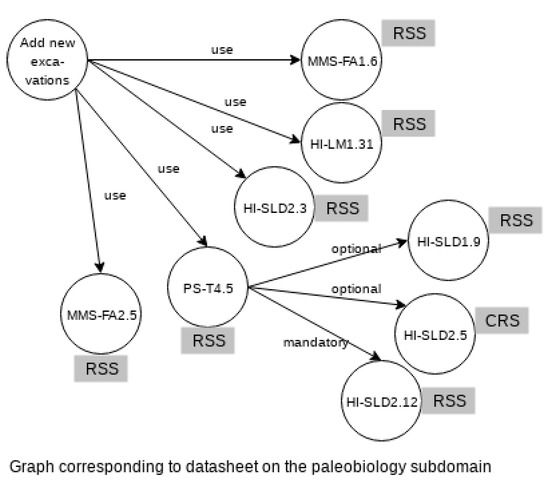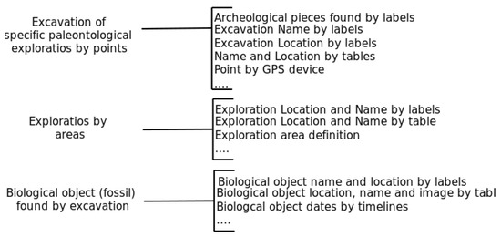 Developing software for paleontologists is not a novelty; however, improving developing techniques, i.e., enhancing quality attributes (reusability among others), is a never-ending research. Nowadays, we can find well-established software providers, even those that differentiate their offerings by including geographic characteristics (https://www.gislounge.com/paleontology-and-gis/). However, building new cost-effective software applications still depends on traditional system analysis techniques, which are currently being elaborated to better fit the needs of the paleontology/paleobiology subdomain. Particularly, software for the automatic documentation of archeological and paleontological pieces preserved as collections has received great attention. By pursuing the goal of standardization, many organizations have joined their forces to propose recommendations and even standards. CIDOC-CRM has contributed to build a lingua franca among people who work on natural heritage conservation. For instance, the Ariadne Conservation Documentation System was developed to fulfill the needs for documentation of the department of Conservation of Antiquities & Works of Art (SAET), Technological Educational Institution (TEI) of Athens [7,8]. During this project, researches agreed on the core information. The Ariadne’s conceptual design took into account CIDOC-CRM concepts and relations as the minimum of information mandatory for the object’s identification. But the Ariadne conservation documentation system was designed and implemented as a relational database; so, dealing with complexity of diagrams potentially hinders the effectivity of the proposal in the real cases. For instance, the concept of conservation, as discussed in [7], is very wide. It includes diverse conservation procedures that may change objects depending on the evidence found. Thus, information increases in a large number of entities and relations that can result confusing in some cases.