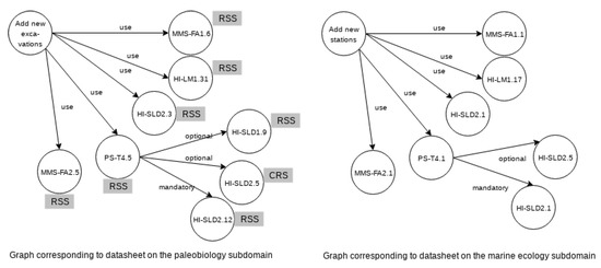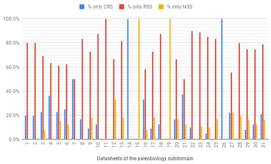 Particular cases are represented by the datasheets 26 and 14, which have only CRS services (Figure 16), so we found the same datasheet (or functionality) in the marine ecology domain. These are the cases of functionalities related to the geography domain, such as making zoom or calculate distances or areas.