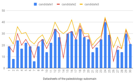 Following, in step 3 we calculated the Equation (1) for each datasheet of the paleobiology subdomain compared to the 60 datasheets in the marine ecology subdomain. Figure 17 shows the resultant costs by considering the three better candidates, that is, the three first datasheets of the marine ecology domain with the lowest costs when it is compared to each of the paleobiology datasheets. The candidates are denoting the first, second and third datasheets in the repository with better results according to the application of Equation (1). For example, for the datasheet 27 we obtained a cost of 16, which corresponds to the cost of making edit operations to transform the datasheet into one of the datasheets already existing in the repository. The datasheet 27 has 5 RSS services and 2 NSS services with respect to the first candidate datasheet, so according to the third step of our reuse analysis process, we calculate resulting in a cost of 16. Then, a cost of 19 was obtained for the second candidate, and 27 for the last one. The rest of the datasheets (compared to datasheet 27) have a higher result, so they are not considered in the figure.