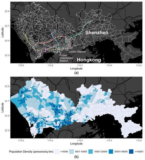 Shenzhen is a city region with a resident population of around 12 million. It lies just to the north of Hong Kong, covers an area of around 2000km2 and is part of a broader region with significant employment in financial services and high-tech industries. Rapid urbanisation and urban transport development resulted in a metro system with five lines and 118 stations by 2014. The metro lines connect with the Hong Kong metro system at Futian Checkpoint Station and Luohu Station. Figure 1a,b shows a map of the Shenzhen metro system with community administrative zones and the population density of each zone. The community boundaries were provided by the Future Transport Lab (Shenzhen). The main urban area is in the mid-southwest, with higher population densities, and the northern and eastern part of Shenzhen are suburban with low densities.