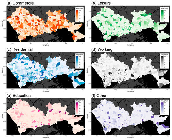 Maps showing the proportions of different land use types in Shenzhen as inferred from the aggregated POI check-ins; (a) Commercial, (b) Leisure, (c) Residential, (d) Working, (e) Education, (f) Other.