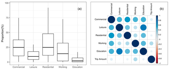 For each catchment area, the number and type of different POI check-ins (residential, working, commercial, leisure, education) were determined. Figure 3a shows the proportion of different type of check-ins using boxplot, and the correlations between different type of POI check-ins number and metro trip amount are illustrated in Figure 3b. Overall, residential POIs contributed to most of the check-ins, followed by retail and working. Education has the lowest proportion on average (Figure 3a). All types of check-ins are found to have positive correlations with metro trip amount (Figure 3b), working presents the highest correlation, followed by commercial and residential.