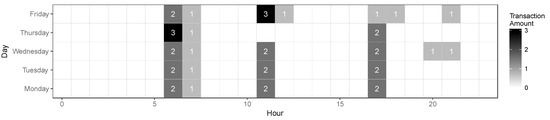 Understanding the travel flows of different types (e.g., students, elderly) of travellers helps uncover new insights into how individuals interact with and use urban space. However, sub-groups of behaviours exist within the broad-scale groups that exhibit more nuanced spatio-temporal characteristics. The sub-groups are worthy of exploring because different travel behaviours are considered to be associated with travellers’ socioeconomic background [6] (e.g., income and education level). Dividing transit users into detailed categories and understanding their travel patterns may help to improve transport services. Rule-based approaches have been used within the literature [6,23,24] to extract certain travel behaviours (e.g., travel in early morning), but this relies heavily on formulated and arbitrary rules. To overcome it, unsupervised learning can be applied to categorise travellers based on their travel behaviour and help to uncover the sub-groups and their behaviour in transit systems. To do this, boarding time profiles were created for each card holder, in which the hourly trips were counted. For example, Figure 4 shows a hypothetical boarding time profile. This passenger made three trips between 6:00–7:00 on Thursday with only two trips made in the other days. The profile is, in essence, a matrix of 5×24, with each number representing the count of tap-ins in 1-hour intervals.