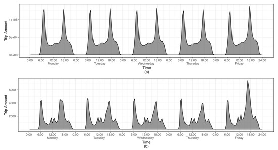 Examining trip frequency and trip temporal density of different groups of users provides insight into their varying mobility patterns. They are also associated with underlying different trip purpose. In order to understand temporal mobility patterns, each day was divided into 48 time intervals, and the number of metro trips in each interval were counted. Figure 6 shows the trip tap-in counts for all travellers and for school students during weekdays. It reveals a degree of regularity of trip patterns. For all passengers, two peak hours on weekdays are evident, one from 7:30 to 8:30 and another from 17:00 to 18:30. First, the pattern for student trips diverges from these general trends in a number of ways. The morning peak is one hour earlier (from 6:30 to 7:30), this is because of earlier school start times (commencing at 7:30–8:00). Second, the number of all travellers’ trips on the Friday evening is slightly higher than on other days. Two small student travel peaks emerge at lunch time, perhaps due to them returning home to eat, with the first peak travelling to home and the second going back to school. The lunch time peak for students on Friday is higher than other weekdays, which is similar to that found in studies of Singapore metro travellers [11]. Additionally, students make more trips in the afternoon and in the evening on Fridays, with the peak volume nearly twice that of other weekday peaks and commencing approximately one hour earlier (16:00) than on other days (17:00). The potential reason for this abnormal bump is examined in Section 5.2.3.