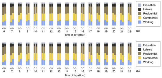 Figure 8 shows the change rate for different kinds of land use inferred from POI check-ins in origins and destinations. Figure 8a allows the overall trip purposes for travellers to be inferred. People leave residential areas and to go to working and education areas in the morning rush hour, between 7:00–12:00, with the greatest value at 7:00. The trends decrease and converge at 11:00. Between 12:00 and 14:00, the overall changes of trips between different land use areas are near to 0, with the rate for working showing a small peak and the rate for residential a small trough, indicating that some travellers return home to eat and then go back for work. Then, from 14:00, the morning pattern is reversed, and the values for residential areas become positive while the values for working and education areas change to negative as travellers begin to leave work and school to return home. There are some increases for commercial areas from 17:00 to 20:00. The change rate of leisure was negative (−12%) in the early morning, it increased and stayed steady around 0 at noon, and finally reached around 10% after 17:00. Unlike the curve of commercial, change rate of leisure stayed around 10% after 21:00, which implies that a certain number of metro travellers made their trip for leisure activities at late night, while trips with commercial purpose are approaching zero (21:00), probably due to the closing time of stores and malls (after 21:00).