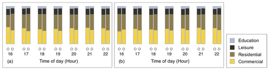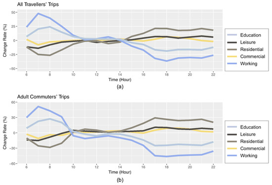 Supplemental contextual information for travel flows can contribute to an understanding of trip purpose [8,32,33]. The analysis of temporal trip purpose utilised the methods described above. Recall that commuters were defined as those transport system users who travelled in the morning (6:00–11:00) for at least four out of the five weekdays. Their trips were compared with trips by all travellers, as shown in Figure 7. This indicates that the main changes in origin and destination proportions are driven by working and residential land uses during normal rush hour periods for both traveller groups, with similar relative increases in education, and that the volumes of trips from and to commercial land use remain constant through the day. However, it is difficult to infer important differences between these groups. To better interpret the temporal variation in travel purpose, the change rate is calculated for the two broad-scale groups at each time interval.