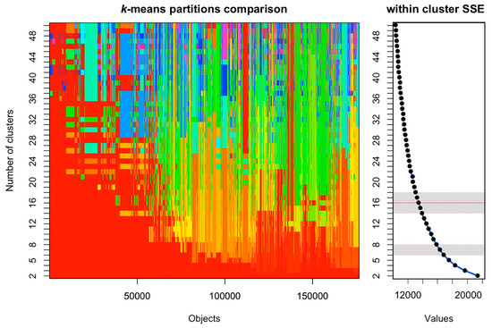 After creating boarding time profile and feature extraction (described in Section 4.2), the k-means algorithm was then used to cluster travellers into different sub-categories. The number of clusters was determined using the “elbow” method [35]. This determines clusters using different values of k for which a cost/evaluation measure is calculated. At some values of k, the cost/evaluation reaches a plateau for further increases in k, indicating an appropriate number of clusters. Figure 11 shows the k-means clustering using different k values. The right scree plot of Figure 11 shows the sum of squared error (SSE) when increasing k, and the left plot indicates students of different clusters in the x axis and the number of clusters in the ordinate, with the clusters represented by colours. When increasing the number of clusters, students are categorised into finer groups with more varied colours. In this study, the elbow cannot be unambiguously identified, and two present themselves: the first and most obvious one is located around k = 5 and another is located between 14 to 18. A value of k = 16 was chosen for the k-means clustering to unpick finer and more varied travel behaviour sub-groups.