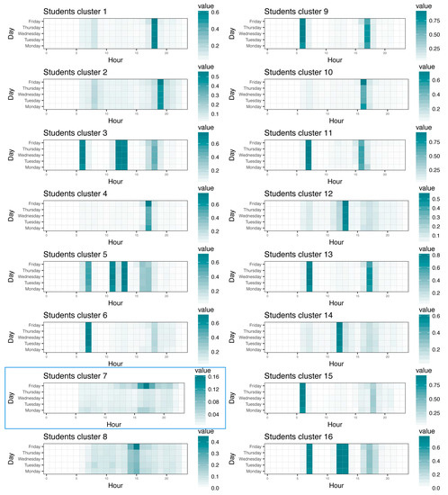 The ratio associated with commercial for cluster 7 students rises significantly from 26.99% to 40.60% during 16:00–17:00 and is then steady during 17:00–19:00 compared to a drop from 40.75% to 35.21% during 17:00–18:00 and a drop throughout the whole period for other students (Figure 13b). In addition, the ratio associated with leisure for cluster 7 students increases during 16:00–18:00 then shows a decrease after 18:00 compared to a steady decrease for other students. The results indicate that many of those in cluster 7 take trips for commercial and leisure-related activities, which is different from other students who are mainly going to residential places.