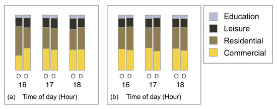 To examine the differences between the land use groups further, a change rate was defined (Equation (1)) to support a clear and deeper analysis of the temporal changes in trip origin and destination,